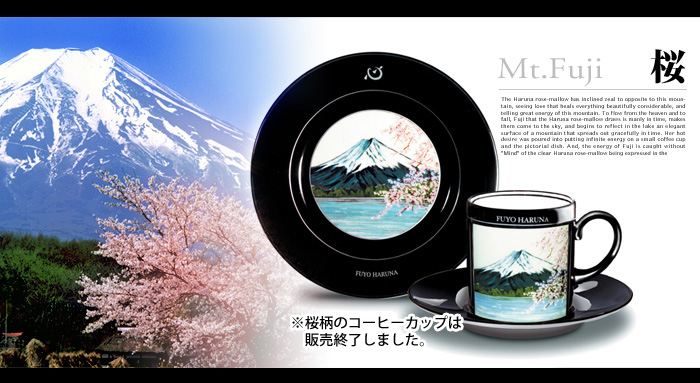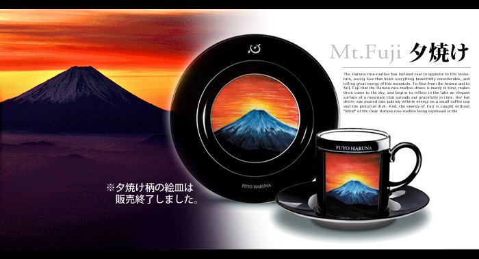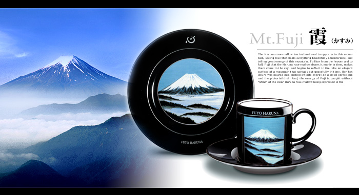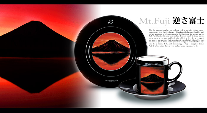 芙蓉春名面對著富士山,看到了所有事物在它偉大而美麗的懷抱中得到療癒的愛,對這座山所擁有的偉大能量滿溢著熱情。春名芙蓉所描繪的富士山,展現出天空中流淌著的優美山川,時而優雅,時而雄偉,浮現於天空之上,映照在湖水中。她的熱情投注在小小的咖啡杯和畫盤上,載滿了無盡的能量。而清涼澄澈的春名芙蓉之「心」,如同清澈的月光般,以其獨特的字體被表現在托盤上,完美地接納了富士山的能量。這個以精湛技術和設計為基礎創造出的「富士山」,突破了世間各種界限與常規,呈現在世人面前。